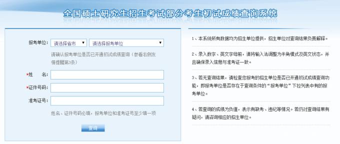 成績(jī)公布后,考生可通過互聯(lián)網(wǎng)、省級(jí)招考管理機(jī)構(gòu)或招生單位公布的熱線電話等途徑查詢考試成績(jī),也可登錄“中國(guó)研究生招生信息網(wǎng)”,按照?qǐng)?bào)考招生單位所在省份點(diǎn)擊進(jìn)入查詢。