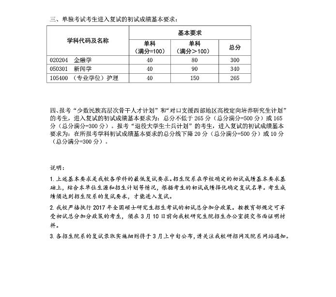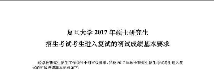 復旦大學2017年碩士研究生招生考試考生進入復試的初試成績基本要求 點擊查看