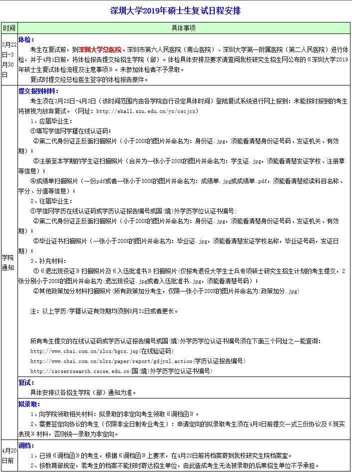 復(fù)試資格審查及日程安排詳見(jiàn)《深圳大學(xué)2019年碩士生復(fù)試日程安排》。