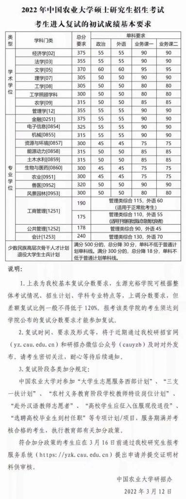 2022年中國農(nóng)大研考復(fù)試基本分數(shù)線發(fā)布院校動態(tài)