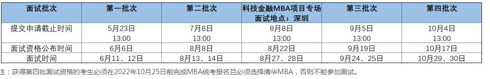 ②填寫(xiě)和上傳申請(qǐng)材料。網(wǎng)上提交的申請(qǐng)材料包括:申請(qǐng)書(shū)、成績(jī)單、個(gè)人簡(jiǎn)歷、收入證明、單位組織結(jié)構(gòu)圖,推薦信(0-3封)。申請(qǐng)材料的具體內(nèi)容和要求見(jiàn)系統(tǒng)內(nèi)說(shuō)明??忌峤簧暾?qǐng)材料時(shí)需要選擇申請(qǐng)面試批次,并在所選批次申請(qǐng)材料提交截止日期前提交。其中科技金融MBA項(xiàng)目專(zhuān)場(chǎng)僅面向申請(qǐng)清華科技金融MBA項(xiàng)目的考生,且面試地點(diǎn)在深圳。各批次的申請(qǐng)截止時(shí)間、面試資格公布時(shí)間和面試時(shí)間見(jiàn)下方”面試批次”表。